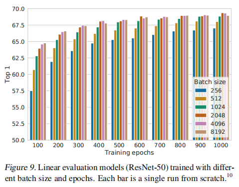 更大的 batch sizes 和更多的 epochs 有益于对比学习