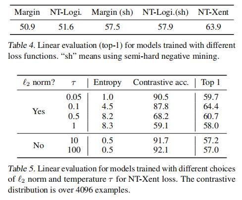 之后 SimCLR 研究者测试了 $\ell_2$ normalization 的重要性 (也就是余弦相似度 vs 点乘) 和 NT-Xent loss 中的 temperature $\tau$ 的选择。结果如上表所示。