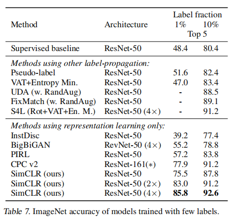 SimCLR 使用标签数据集 ILSVRC-12 中训练集采样的 $1%$ 或 $10%$ 进行训练 (对应的每一类有 ~12.8,~128 张图片)。结果如下表所示:
