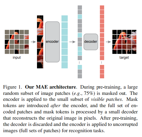 所以 encoder 的任务是:处理没 mask 掉的块,输出 latent representation,decoder 的任务是,把 mask 掉的块和 latent representation 合并的信息作为输入,输出重建图像。