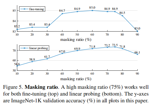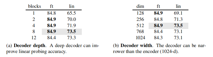 在视觉领域中,decoder 重建的是低维语义级别的 pixels。在语言领域中,它重建的是具有丰富语义的信息。虽然在 BERT 中 decoder 没有那么重要,但是在图像领域中,decoder 对于学到的 latent representation 的语义级别具有决定性的重要作用。