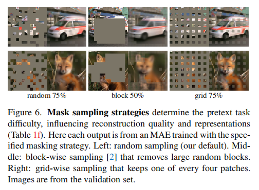 跟随 ViT 的思想,MAE 把图片分为正常的没有重叠的 patches 然后使用均匀分布随机取样然后 mask 掉剩余的块 (不做替换)。