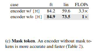 encoder w/ [M] 把 masked patches 也作为输入,encoder w/o [M] 不把它作为输入。