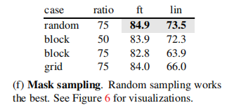 为了克服这一不同并且学到更多有益的特征,我们发现了一个在 CV 领域很有用的简单策略:随机 mask 掉非常大比例的 patches。这个策略大幅度减少了冗余而且创造了一个非常有挑战性的自监督任务。这个任务要求模型要求模型掌控全局信息,而不是仅仅拥有 low-level 图像信息的理解 (例如局部缺失的物体形状,颜色等等)。