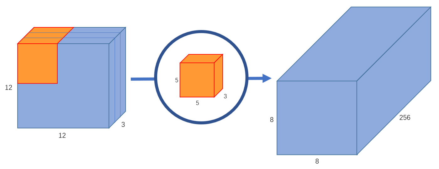 如上图所示,输入大小为$12\times 12\times 3$,kernel大小$5\times 5$,输出大小为$8\times 8\times 256$,参数量为:$5\times 5\times 3\times 256$。